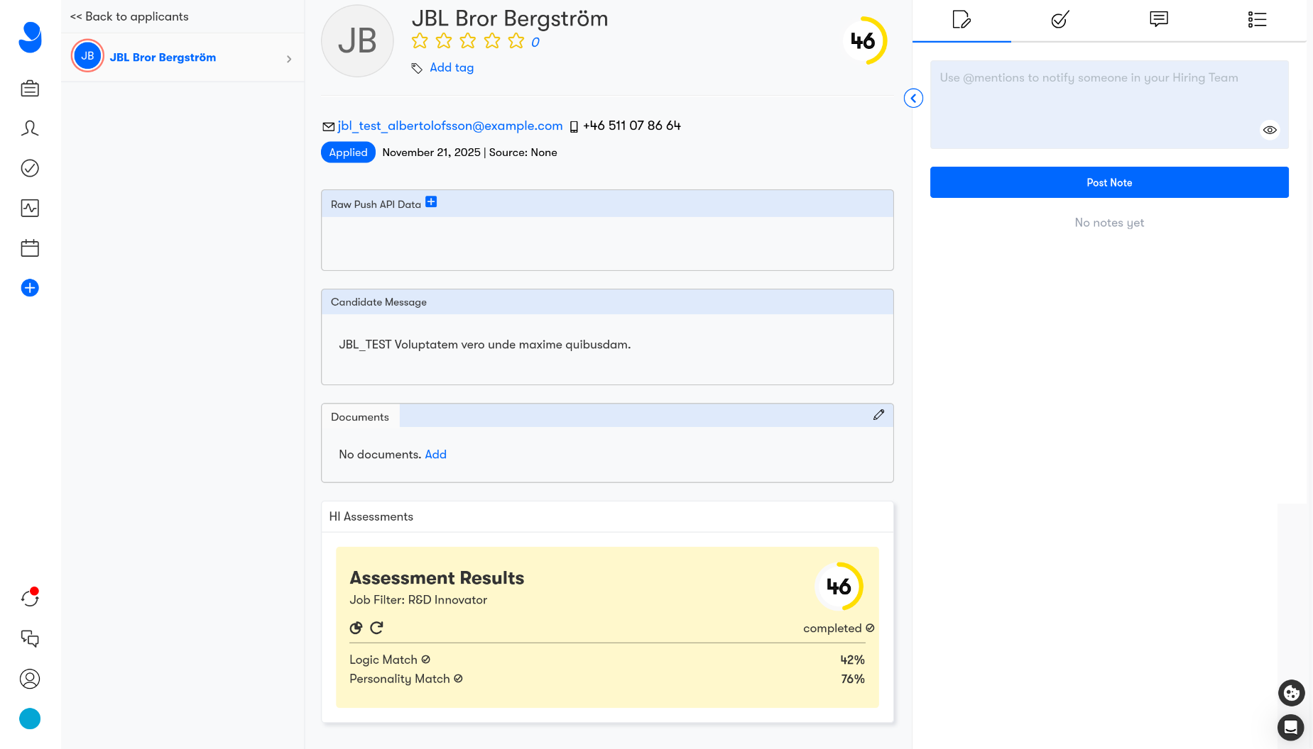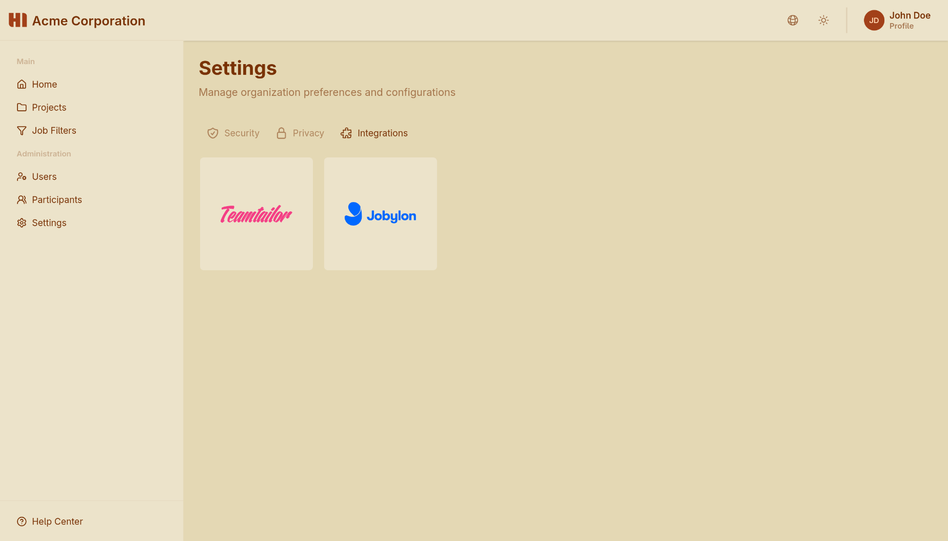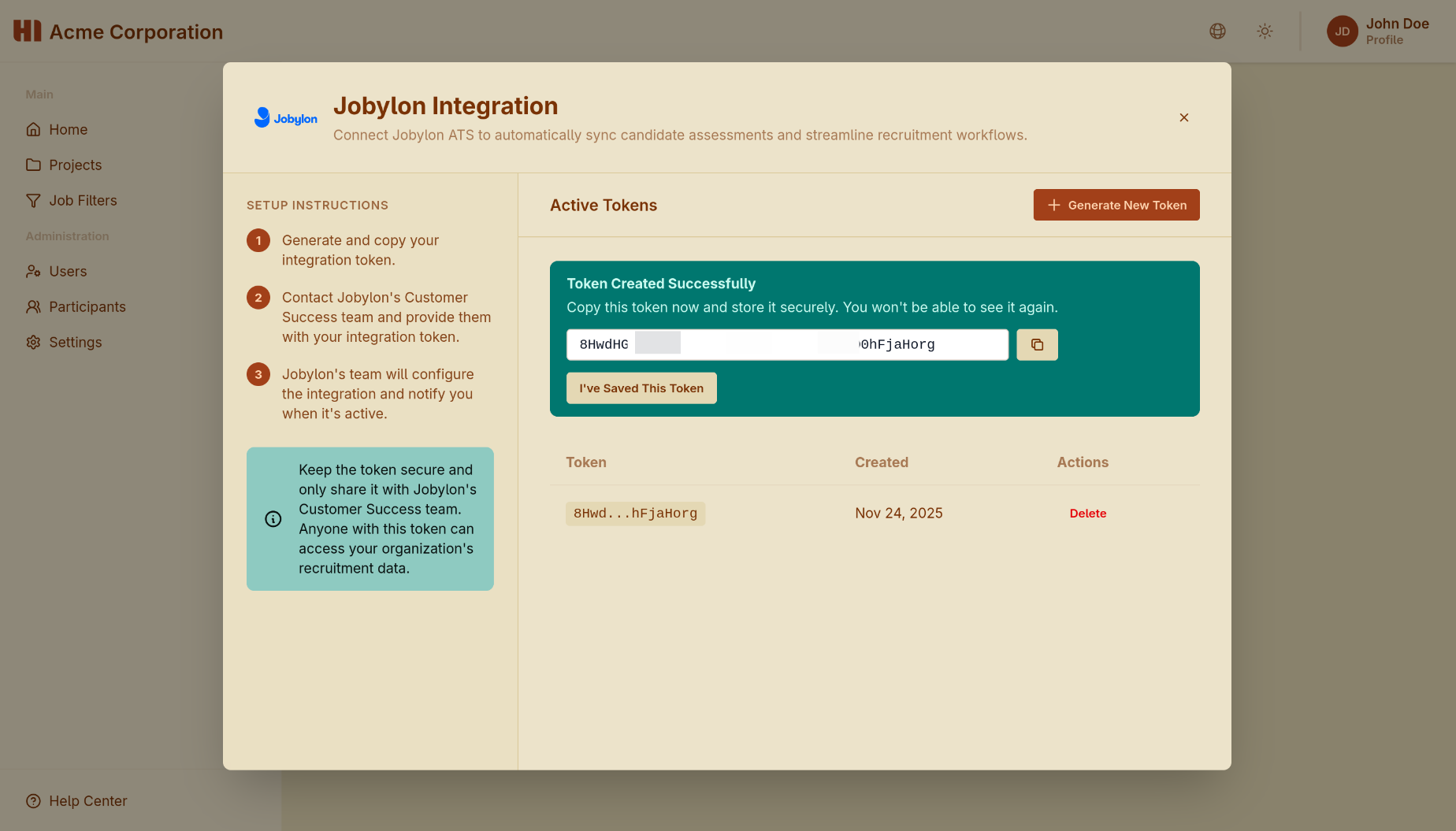 Section titled “Getting Started”This guide will walk you through setting up the HI Assessments integration with Jobylon ATS. The process involves generating an integration token, working with Jobylon’s team to enable the integration, and configuring assessment automation in your recruitment pipeline.