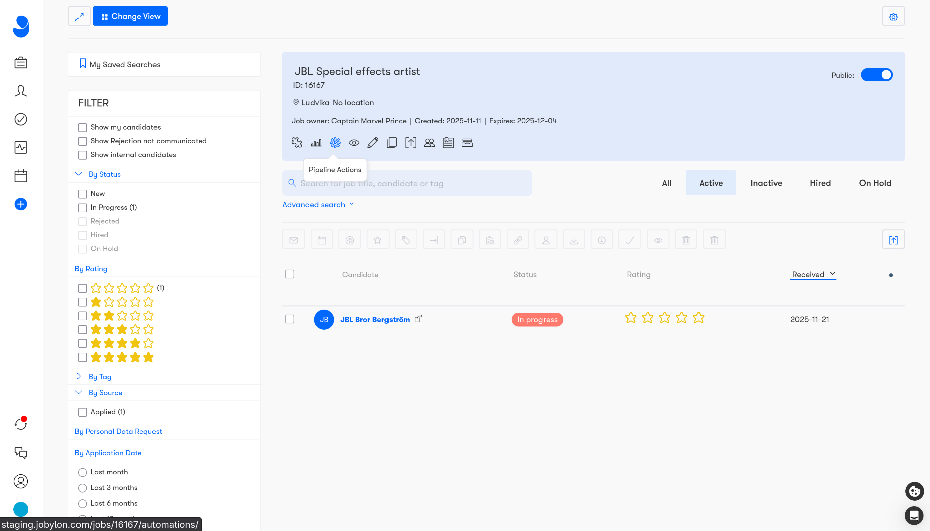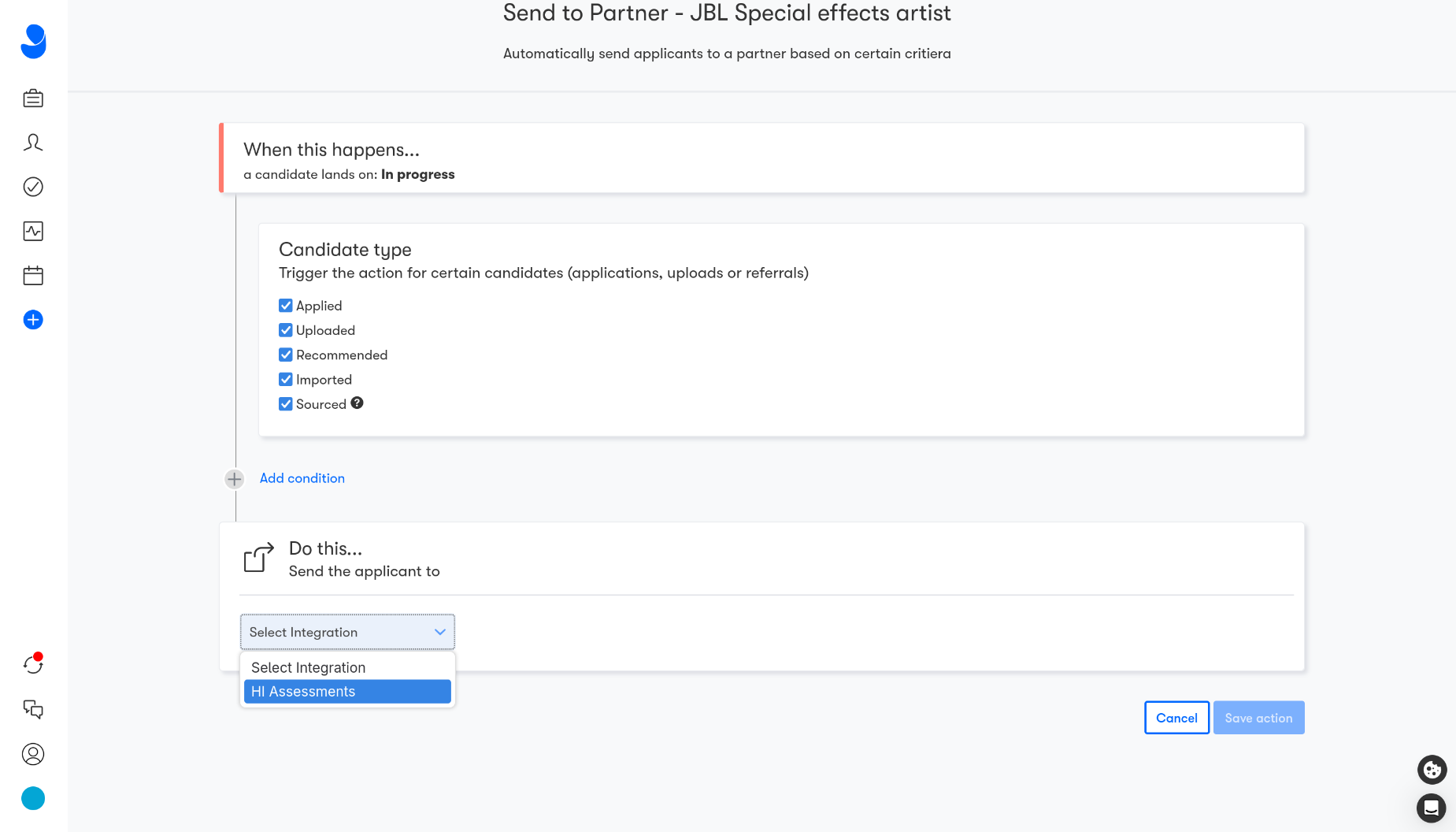 Section titled “Step 4: Set Up Pipeline Actions”Now you’ll configure when candidates should receive assessments by setting up a pipeline action.