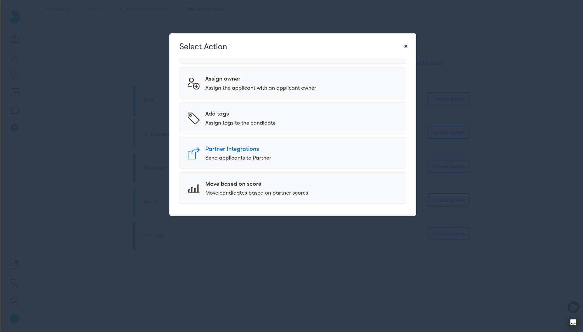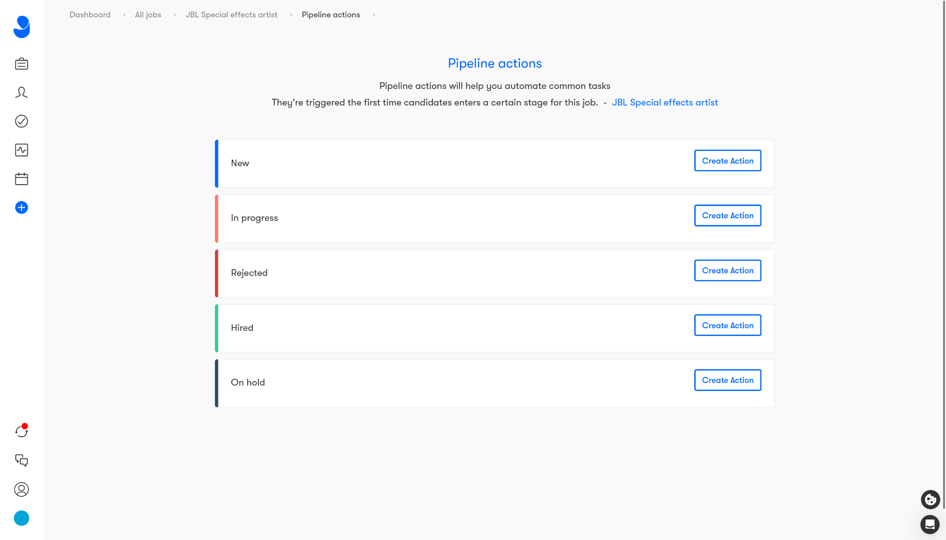 - You’ll see your pipeline stages. Choose the stage where candidates should receive assessments and click Create Action